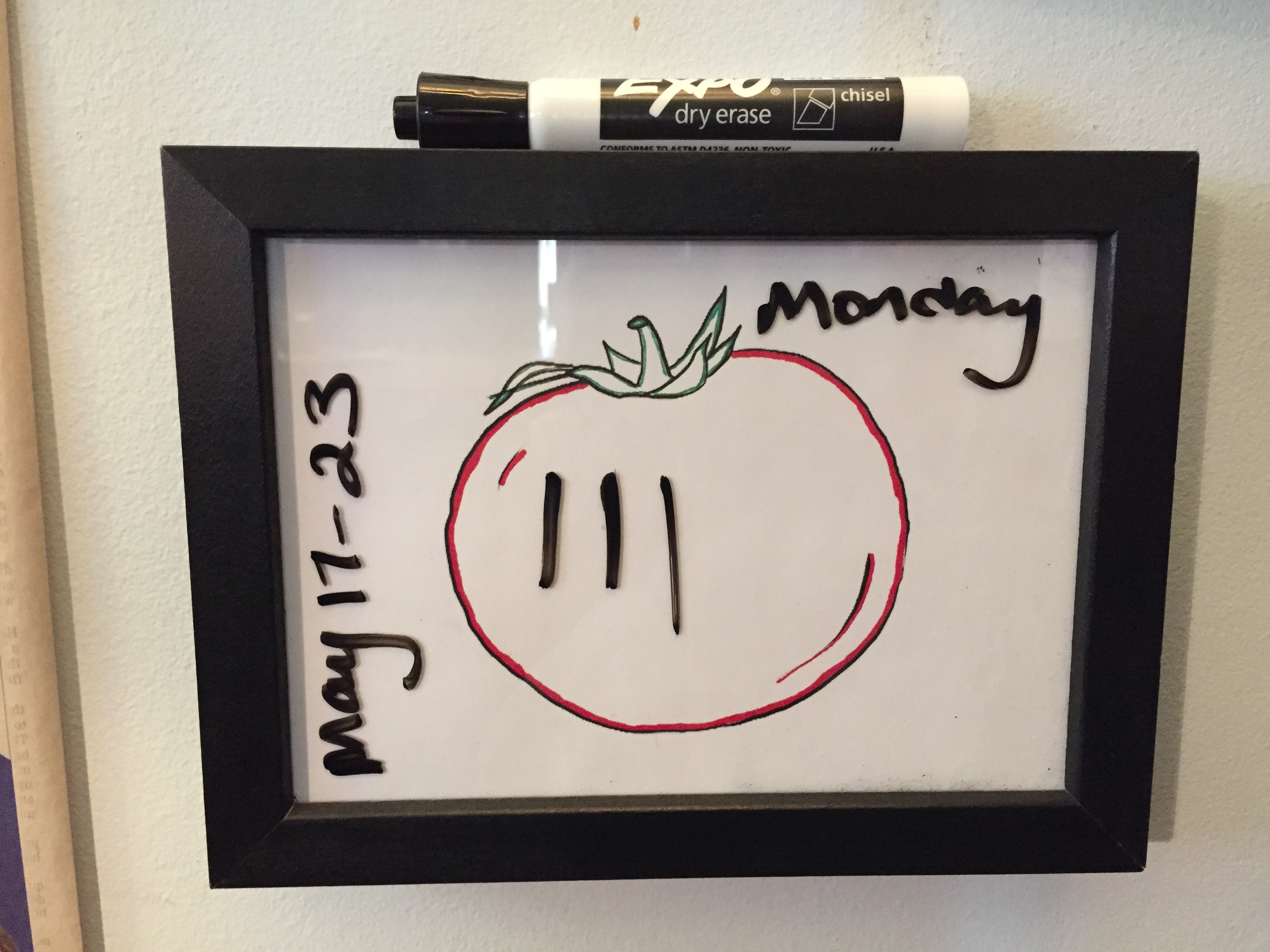 And in the spirit of gamification, I’ll let you know how I track my pomodoros. I made myself a little tomato picture and put it in a frame under glass. I add a hash mark each time I complete a true pomodoro (I don’t count the ones that are interrupted by students or colleagues during my student conference hours), and then I add them up at the end of each month. It’s nice to quantify the work I do, and I like to compete against myself to improve upon each month.