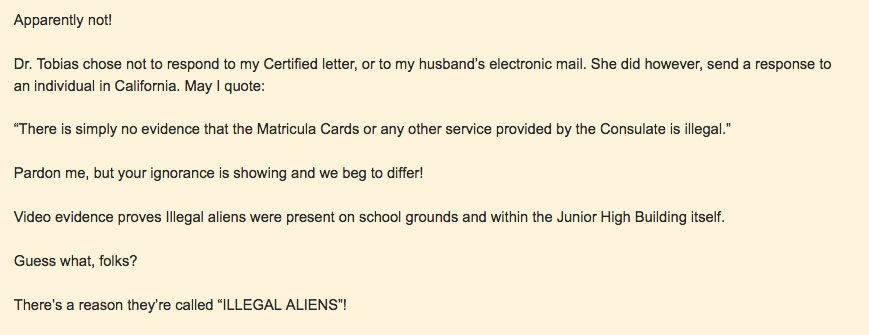 But these archived posts are not the only traces of Diane Evertsen’s problematic views. In 2008, the Mexican Consulate visited Harvard Junior High School to register community members for consular ID cards, and Evertsen, a resident of Harvard, protested. She gave a three-minute presentation to the Harvard school board. Her message was intolerant but not surprising, given her affiliation with the “Minuteman Project.”