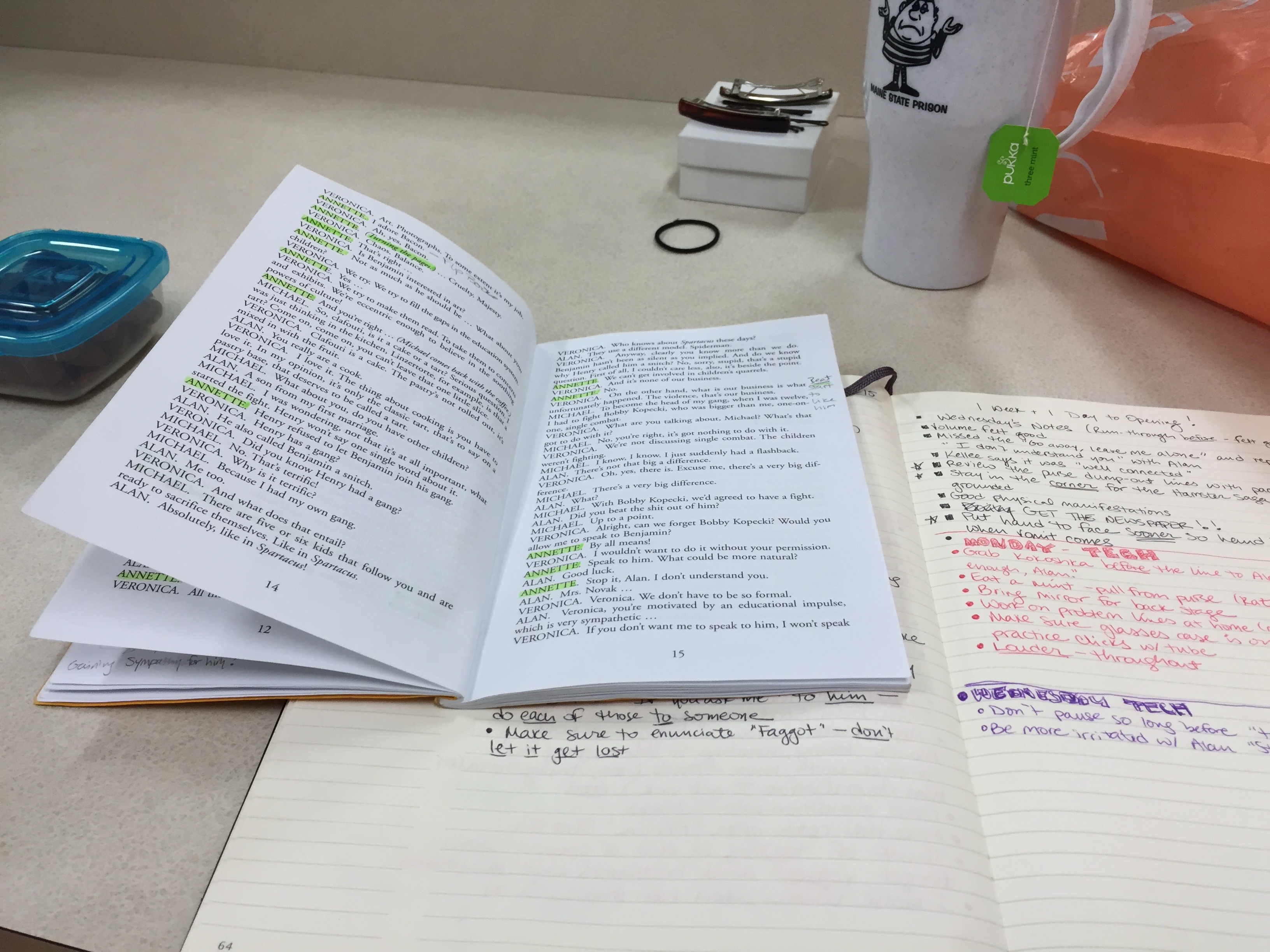 And our comfortable, relaxed, and frequently silly backstage energy fed us last night, for the opening night of the show. Our ninety-seat black box theater space had an audience of about sixty, and let me tell you, they were terrific. They laughed and cringed and reacted visibly and audibly. It was a wonderful relief. I’d forgotten how funny this play is — our director and crew have sat through it about a dozen times; we’re used to them, and during tech early this week they were much more concerned about lights, sound cues, and costuming than they were about laughing at us. But having a room full of strangers laugh where you want them to (and laugh where you don’t expect them to) was new, fresh, and fantastic.