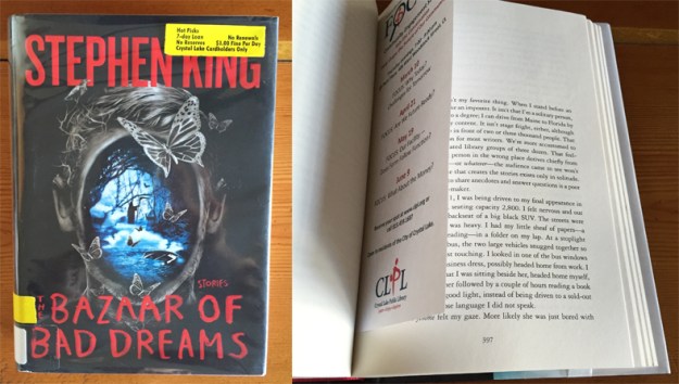 Three weeks ago I picked up Stephen King’s latest collection of short fiction, The Bazaar of Bad Dreams, at my local book joint, the Crystal Lake Public Library. The book was marked as a “Hot Pick,” which meant that it could only be checked out on a seven-day loan, and it couldn’t be renewed. It’s a good-sized book, coming in at just under five hundred pages, so I was disappointed when I had to return it having only read half. But moments after I dropped my copy into the “Returns” book slot, I wandered to fiction and saw that there was another copy of the same book on the Hot Picks shelf; so obviously I grabbed it. Excellent loophole, CLPL!
