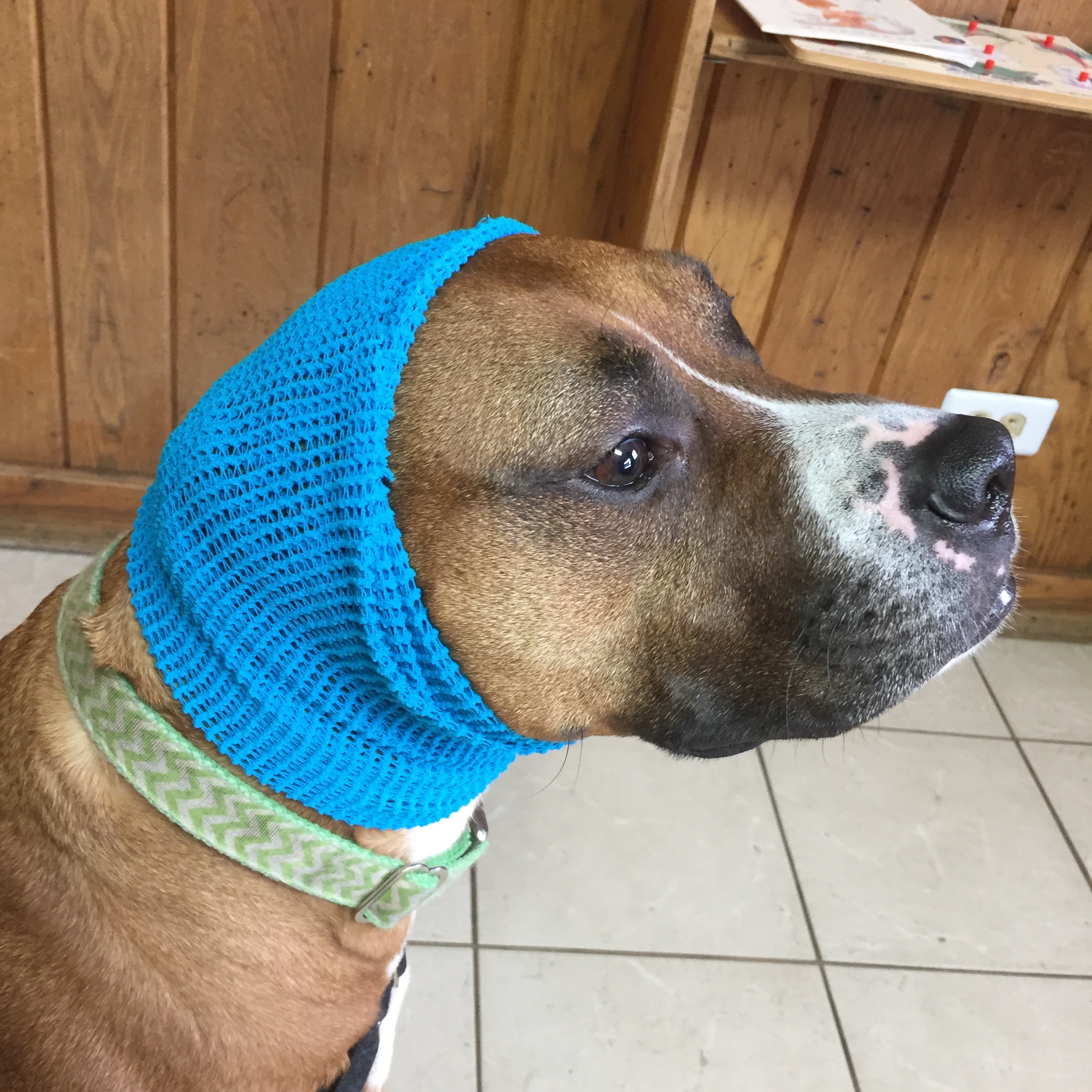 She has this little scabby on the end of her ear that never really heals; she shakes her head and it immediately breaks off and shoots little blood droplets all over the place. We usually put a band-aid on it, but at her latest vaccination appointment the vet gave her some medicine to help with blood clotting and fitted her with this amazing head piece to help her ears from flopping around.