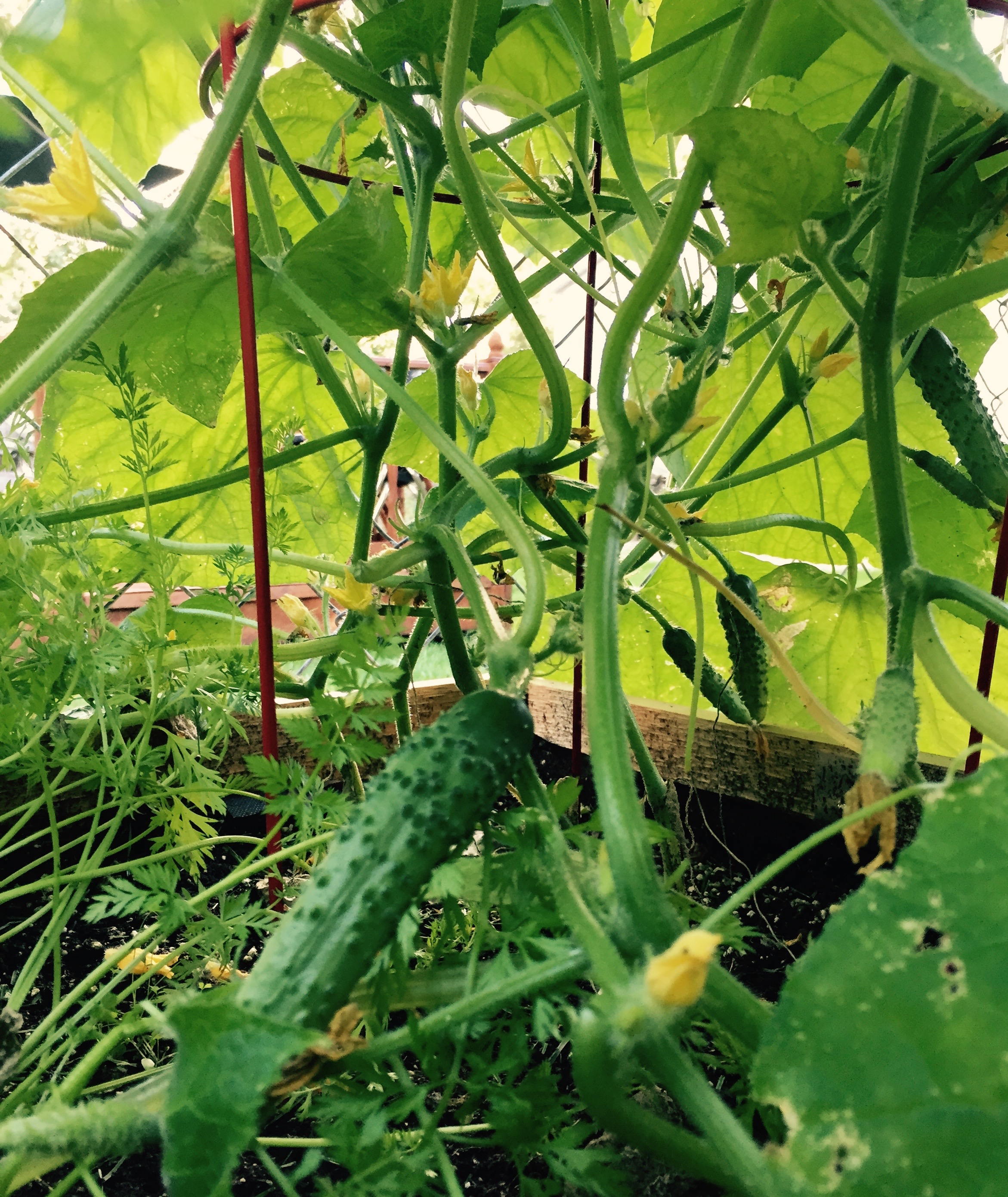 And the cucumbers are coming in slowly, but thank goodness they’re coming in at all. I planted four seeds and the plants that grew from those seeds are not-so-slowly taking over our entire planter box. I thought for sure that we wouldn’t get any actual cucumbers, but that we would just be smothered in our sleep one night. It’s bananas. No — it’s cucumbers! (ha!)