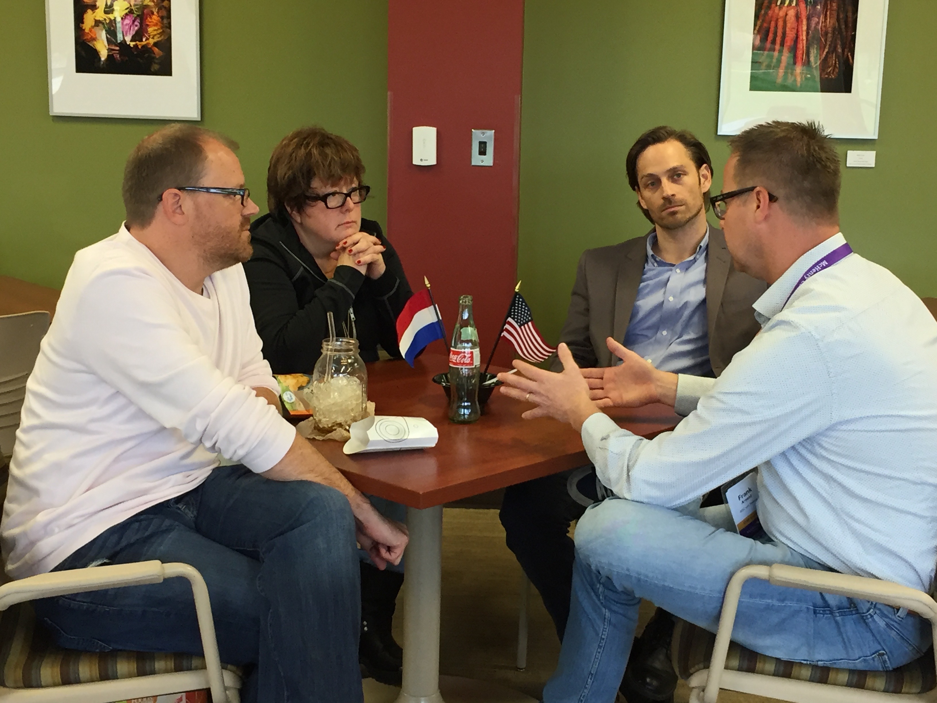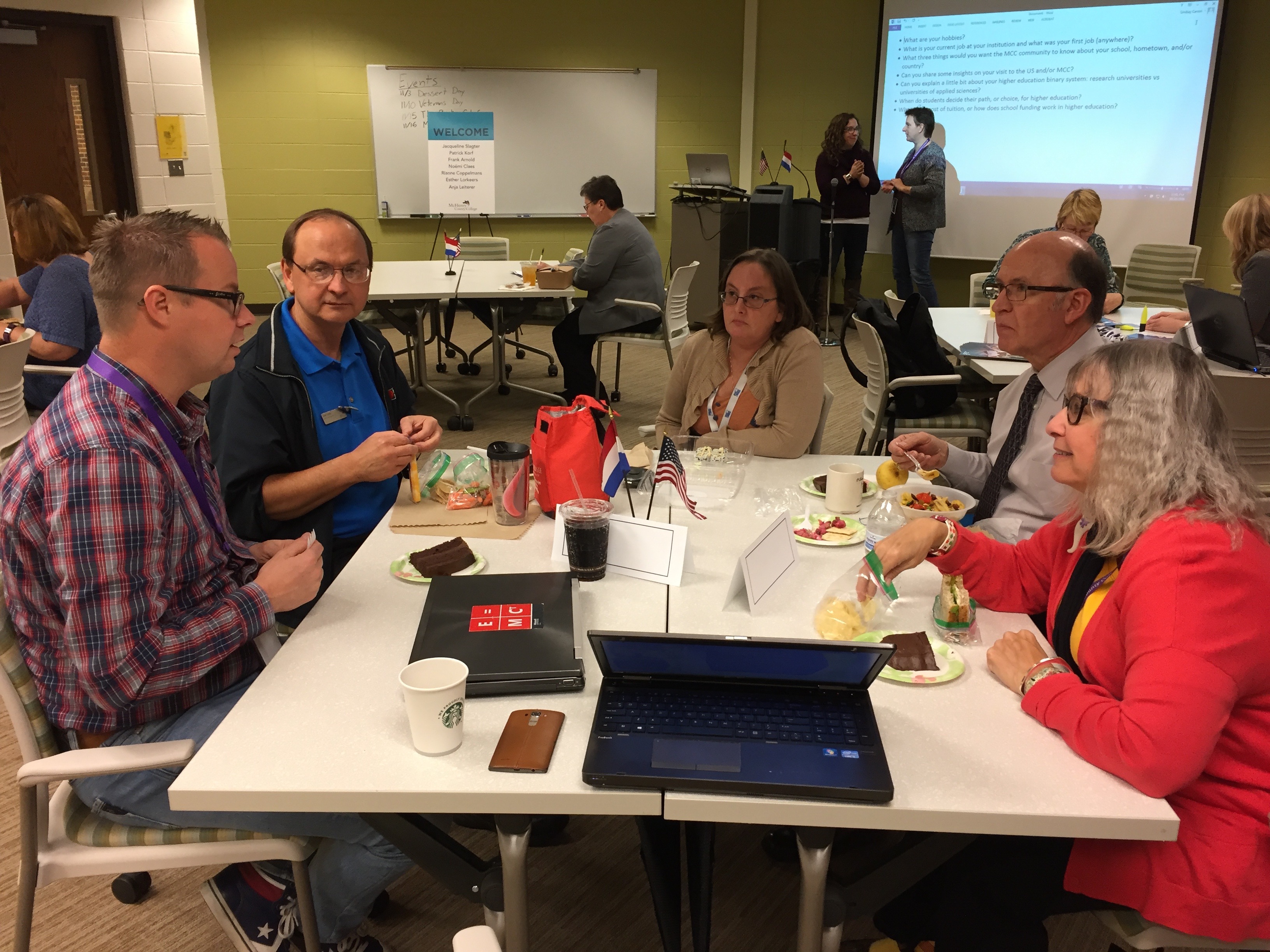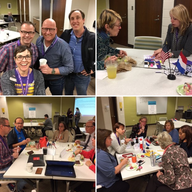 Luckily, Wednesday and Thursday were going to be spent at MCC, so Noëmi didn’t have to travel far. But on Wednesday, she did have to put her scholarly game face on for the “Brown Bag Round Table” discussion the seven visitors were going to lead. We prepared our room with Dutch/U.S. friendship flags, and took some pre-round table selfies with Frank’s selfie stick (my first selfie stick picture!):