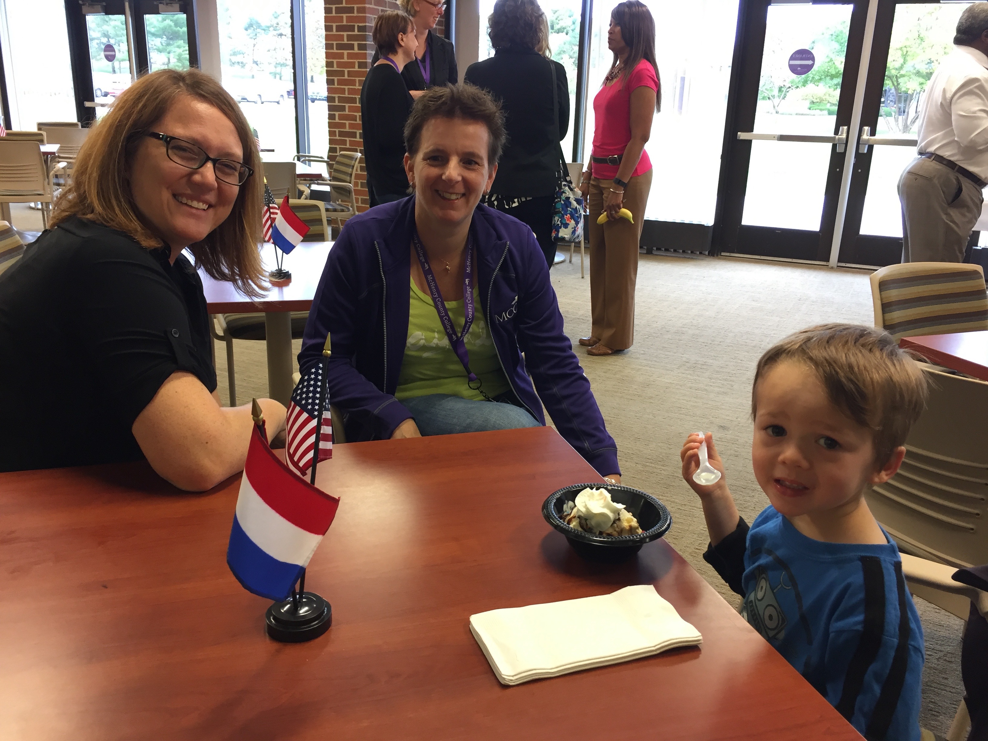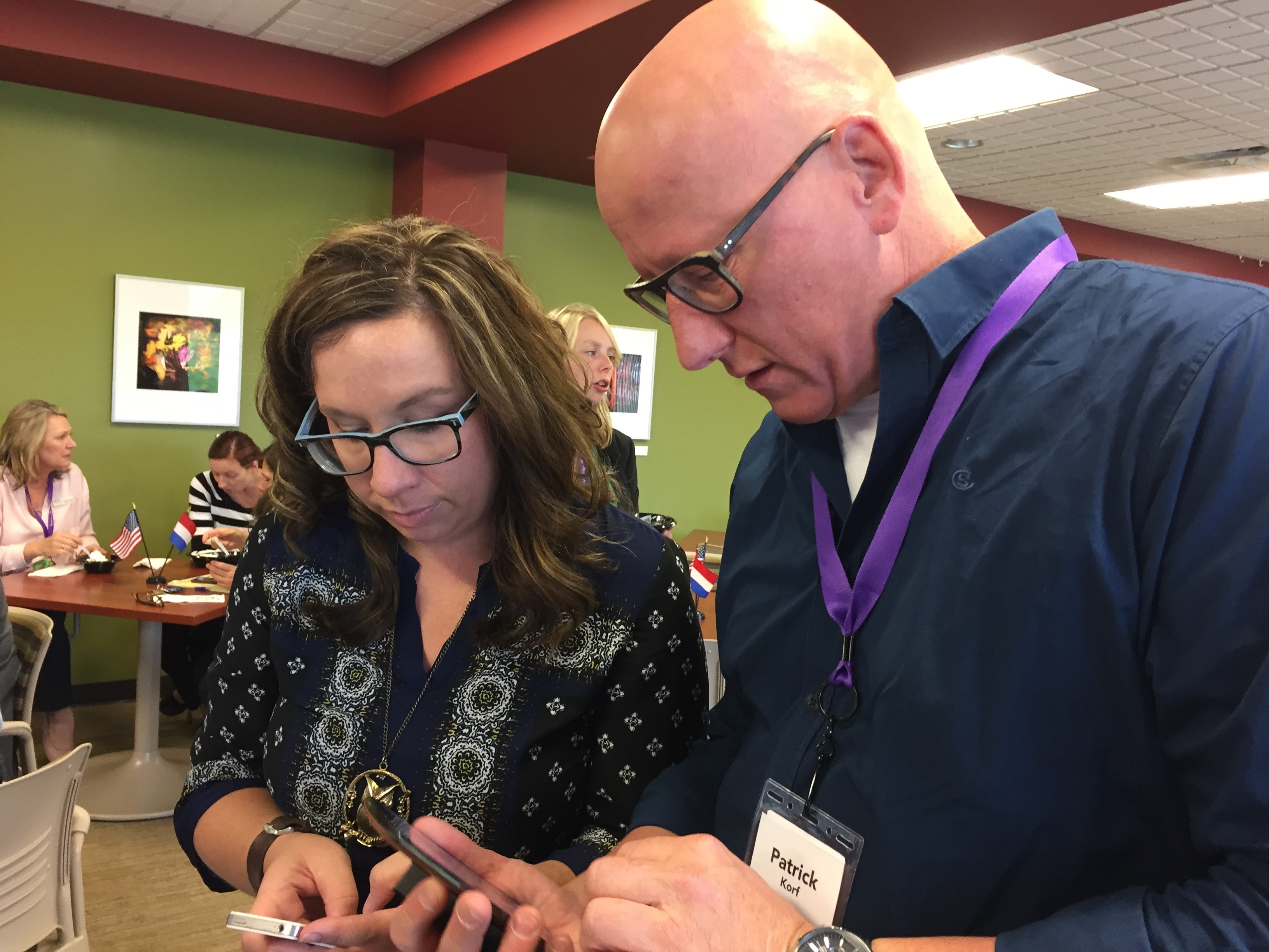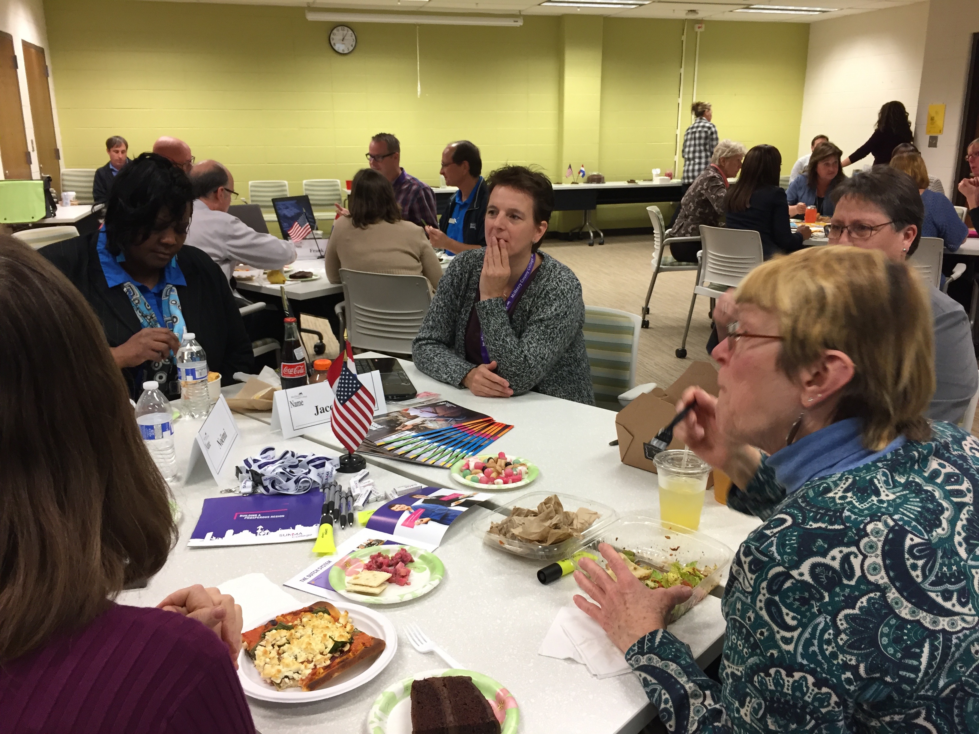Luckily, Wednesday and Thursday were going to be spent at MCC, so Noëmi didn’t have to travel far. But on Wednesday, she did have to put her scholarly game face on for the “Brown Bag Round Table” discussion the seven visitors were going to lead. We prepared our room with Dutch/U.S. friendship flags, and took some pre-round table selfies with Frank’s selfie stick (my first selfie stick picture!):