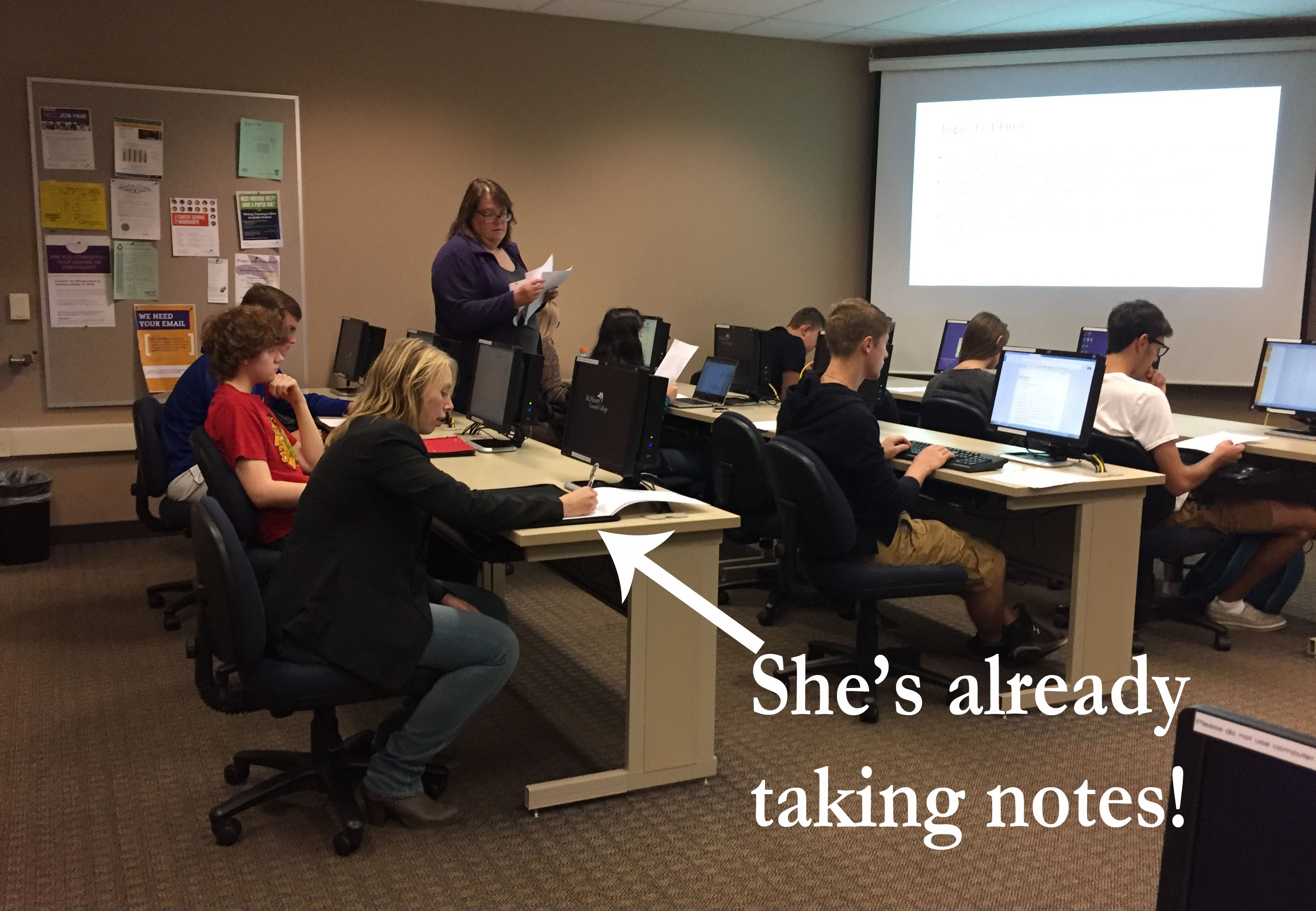 On Thursday, Noëmi visited Lisa’s class — her final observation — and attended one of our Faculty Council standing committee meetings on curriculum development and review. She and her colleagues at Summa College recently wrote some new curriculum and are hoping to write more, so she was eager to learn more about our process at MCC.