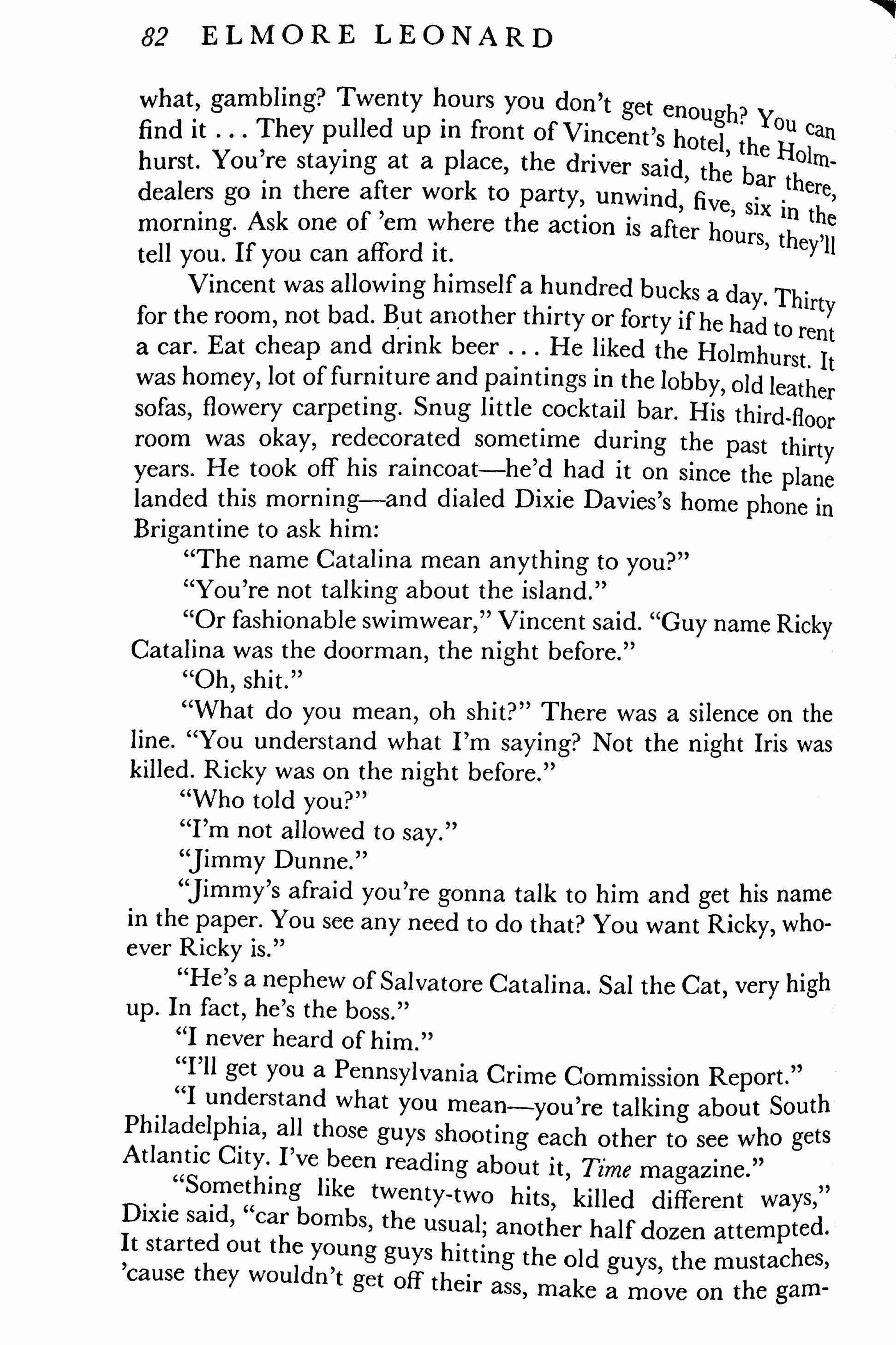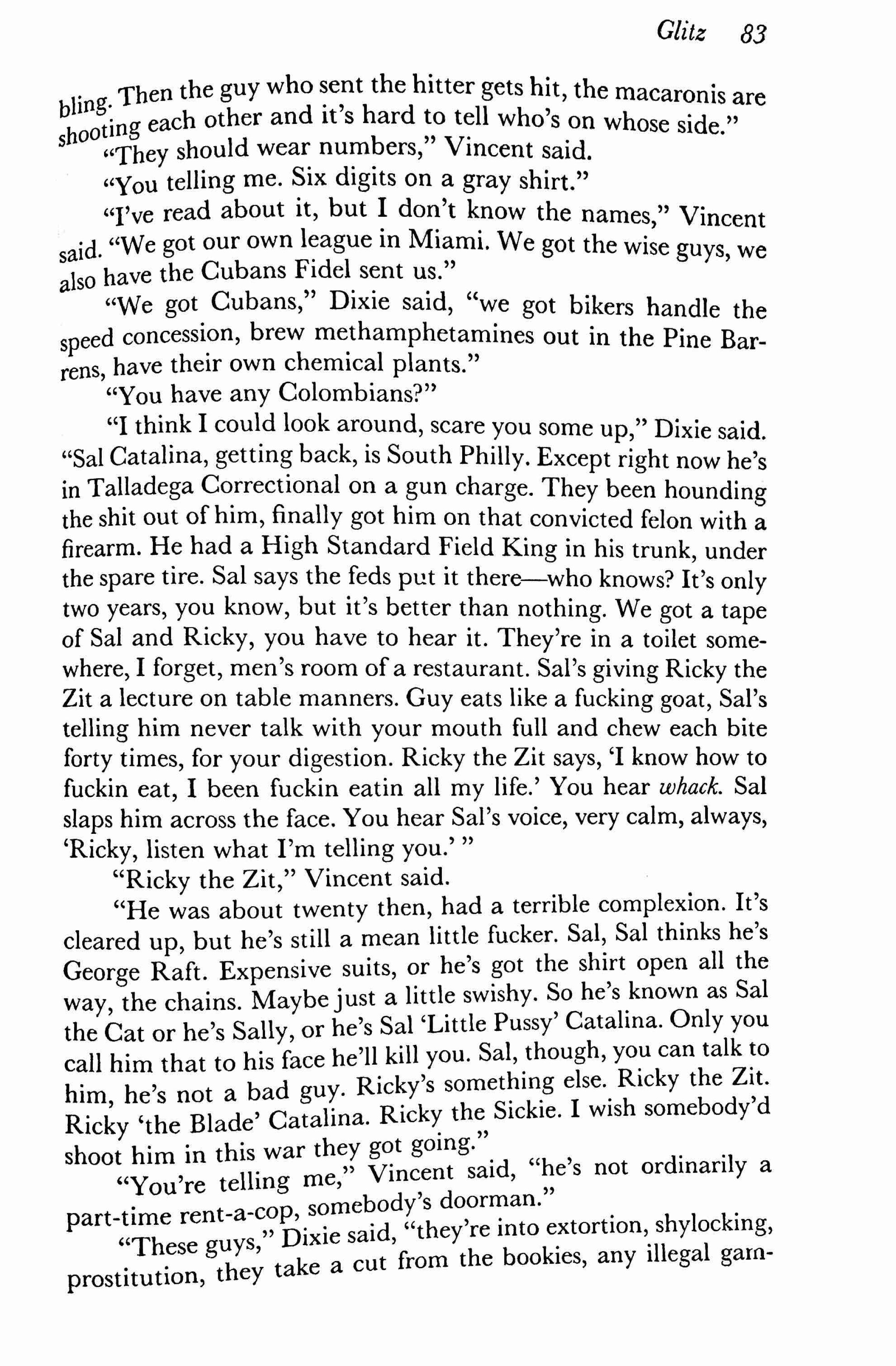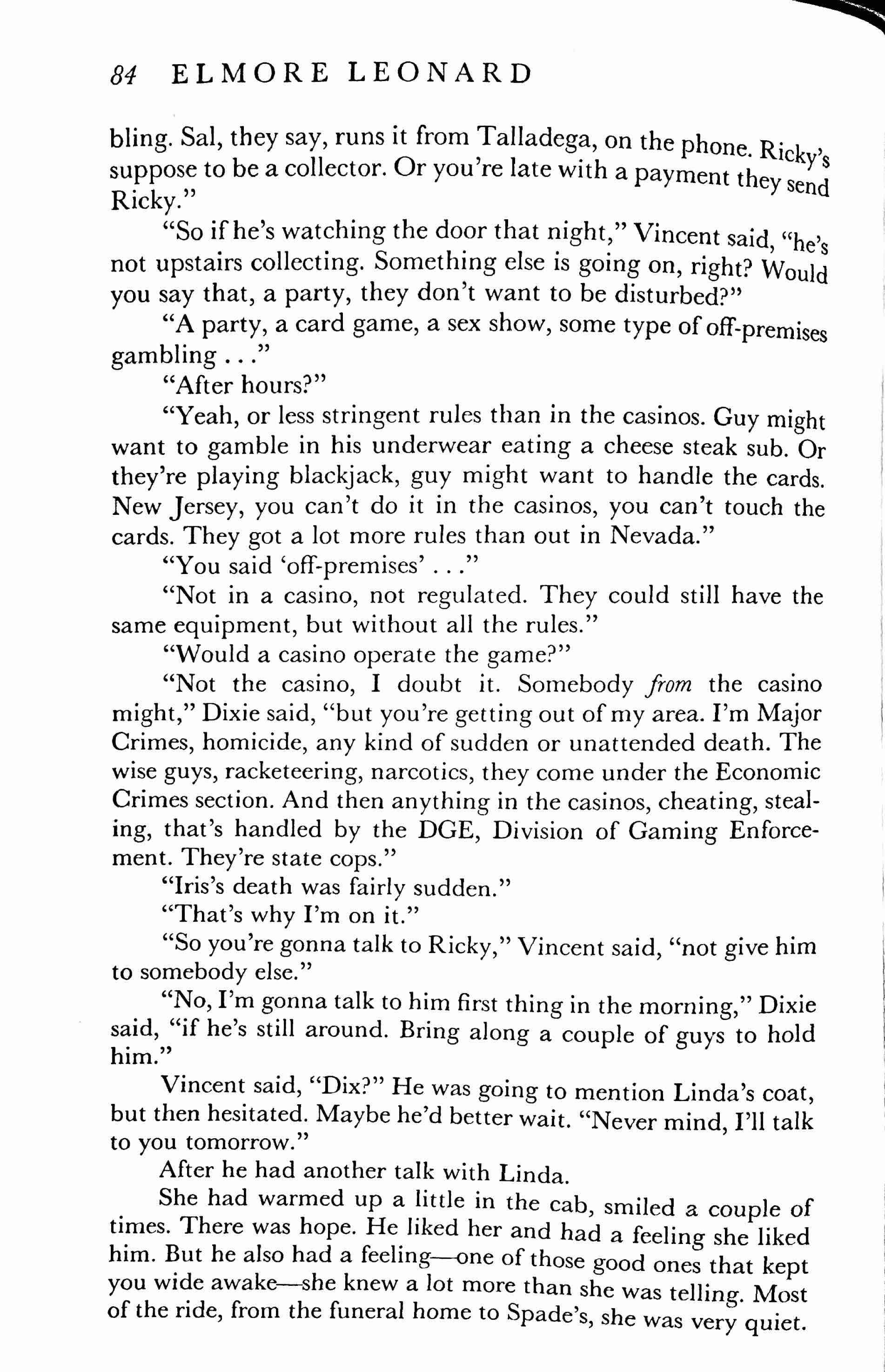 And now, here is his work in action, from his novel Glitz, the last four pages of Chapter 9. Notice the way he works in summary dialogue (without the quotation marks, not every word, just as part of the narration):